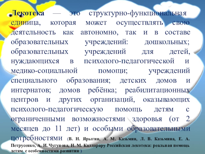 автономно, так и в составе образовательных учреждений: дошкольных; образовательных учреждений для детей, нуждающихся в психолого-педагогической и медико-социальной помощи; учреждений специального образования; детских домов и интернатов; домов ребёнка; реабилитационных центров и других организаций, оказывающих психолого-педагогическую помощь детям с ограниченными возможностями здоровья (от 2 месяцев до 11 лет) и особыми образовательными потребностями (В. Н. Ярыгин, А. М. Казьмин, Л. В. Казьмина, Е. А. Петрусенко, А. И. Чугунова, Н. М. Калдарару Российская лекотека: реальная помощь детям с особенностями развития )