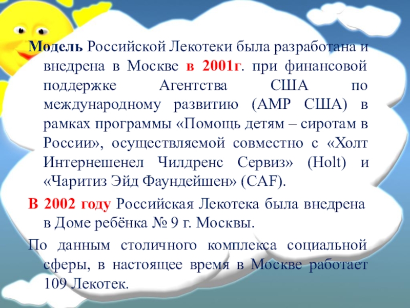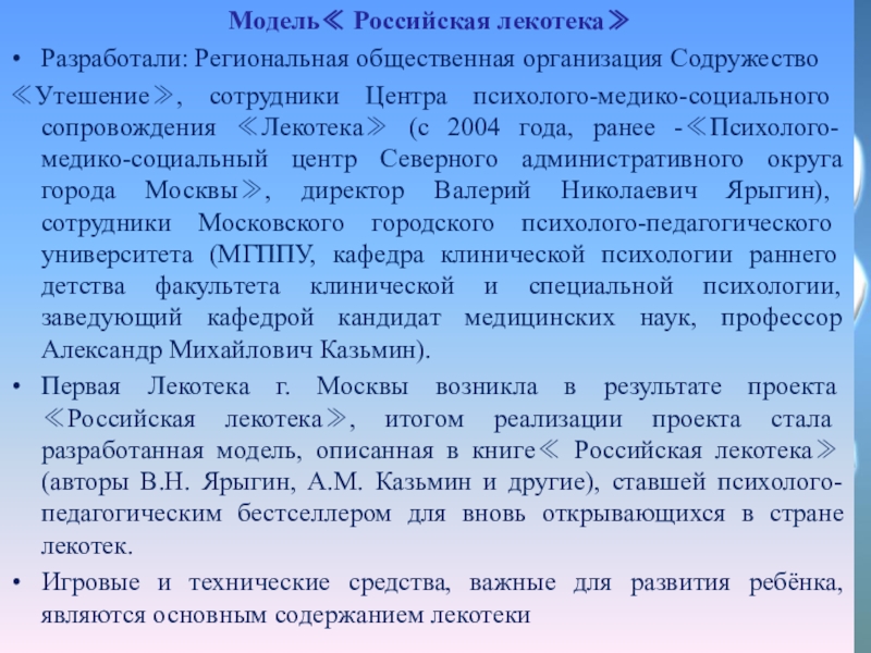 Слайд 13Модель Российской Лекотеки была разработана и внедрена в Москве в 2001г.