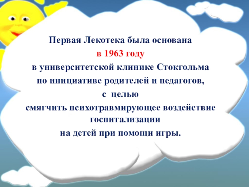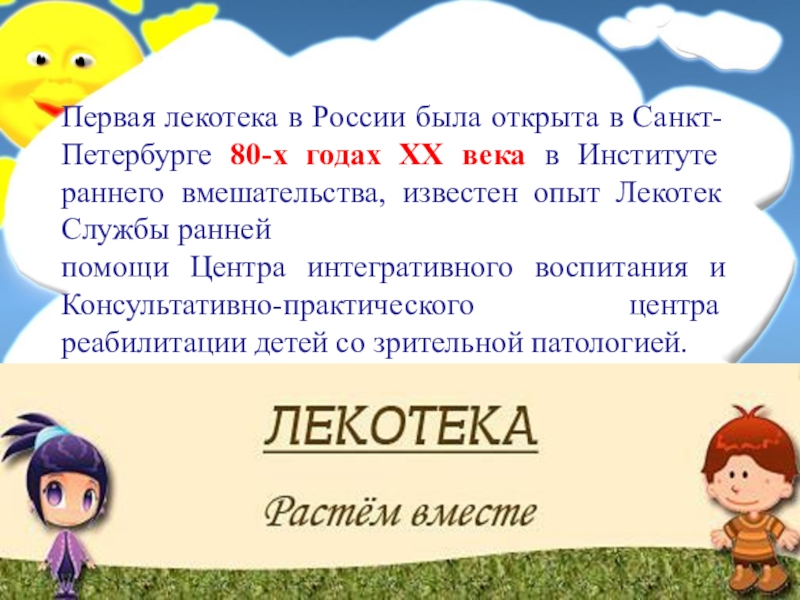 Слайд 12Первая лекотека в России была открыта в Санкт-Петербурге 80-х годах XX