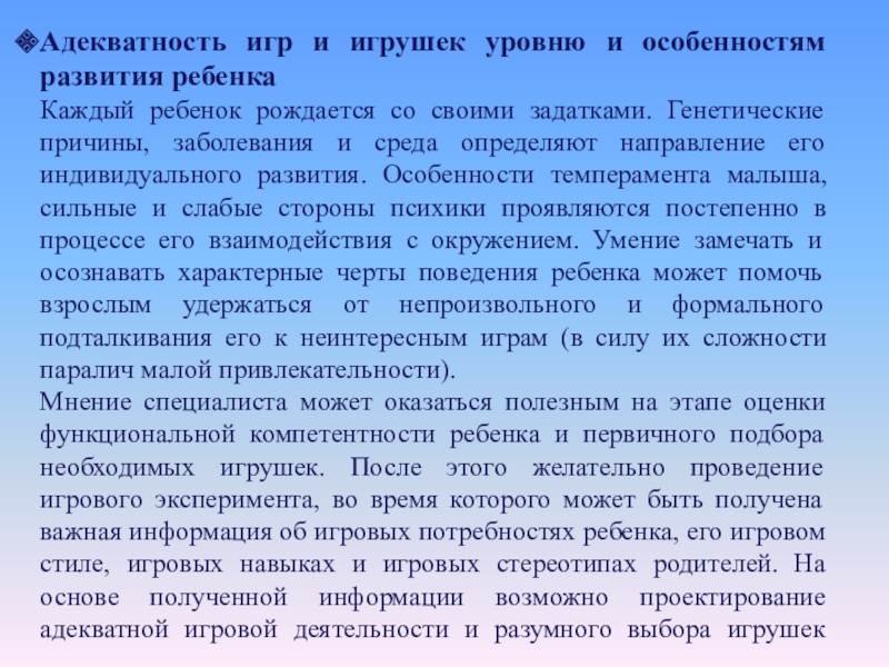 Мнение специалиста может оказаться полезным на этапе оценки функциональной компетентности ребенка и первичного подбора необходимых игрушек. После этого желательно проведение игрового эксперимента, во время которого может быть получена важная информация об игровых потребностях ребенка, его игровом стиле, игровых навыках и игровых стереотипах родителей. На основе полученной информации возможно проектирование адекватной игровой деятельности и разумного выбора игрушек