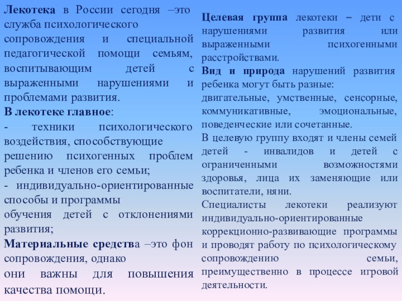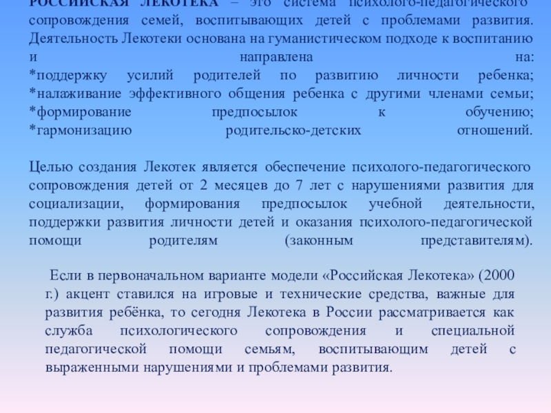 Слайд 15РОССИЙСКАЯ ЛЕКОТЕКА – это система психолого-педагогического сопровождения семей, воспитывающих детей с