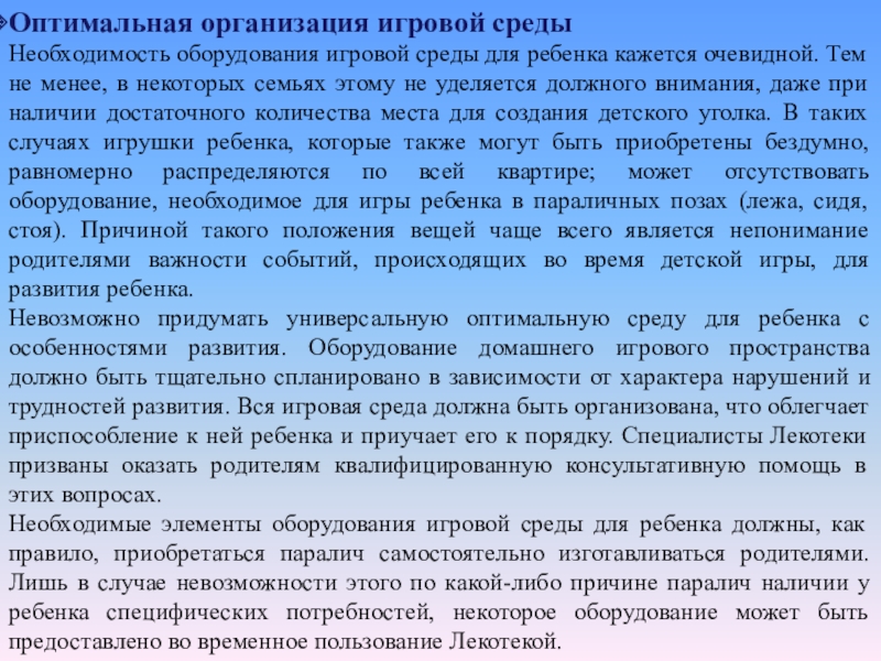 Невозможно придумать универсальную оптимальную среду для ребенка с особенностями развития. Оборудование домашнего игрового пространства должно быть тщательно спланировано в зависимости от характера нарушений и трудностей развития. Вся игровая среда должна быть организована, что облегчает приспособление к ней ребенка и приучает его к порядку. Специалисты Лекотеки призваны оказать родителям квалифицированную консультативную помощь в этих вопросах.