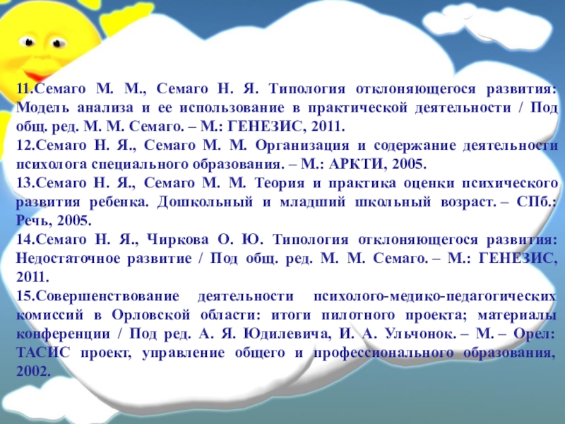 14.Семаго Н. Я., Чиркова О. Ю. Типология отклоняющегося развития: Недостаточное развитие / Под общ. ред. М. М. Семаго. – М.: ГЕНЕЗИС, 2011.