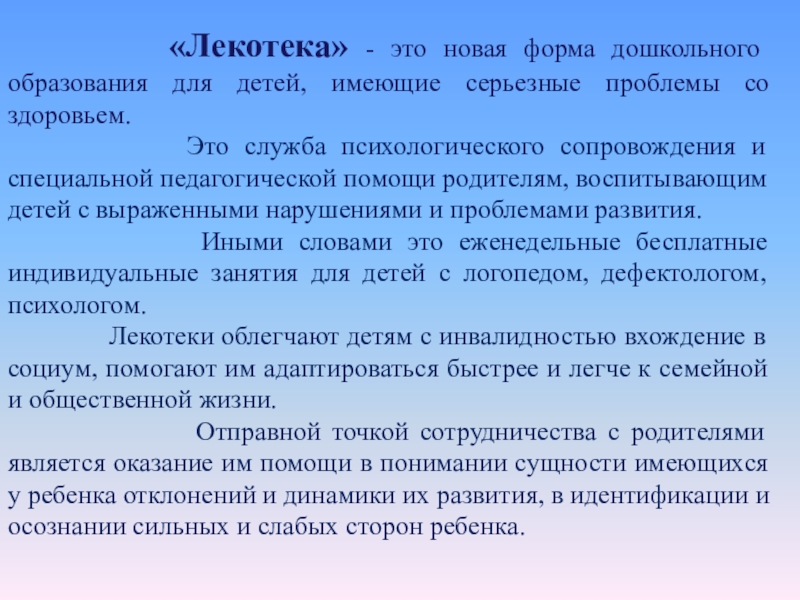 Это служба психологического сопровождения и специальной педагогической помощи родителям, воспитывающим детей с выраженными нарушениями и проблемами развития.