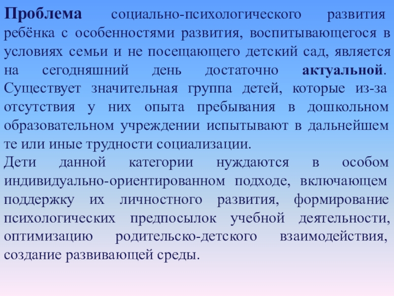 Слайд 7Проблема социально-психологического развития ребёнка с особенностями развития, воспитывающегося в условиях семьи