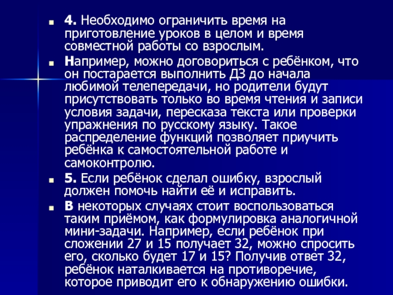 4. Необходимо ограничить время на приготовление уроков в целом и время