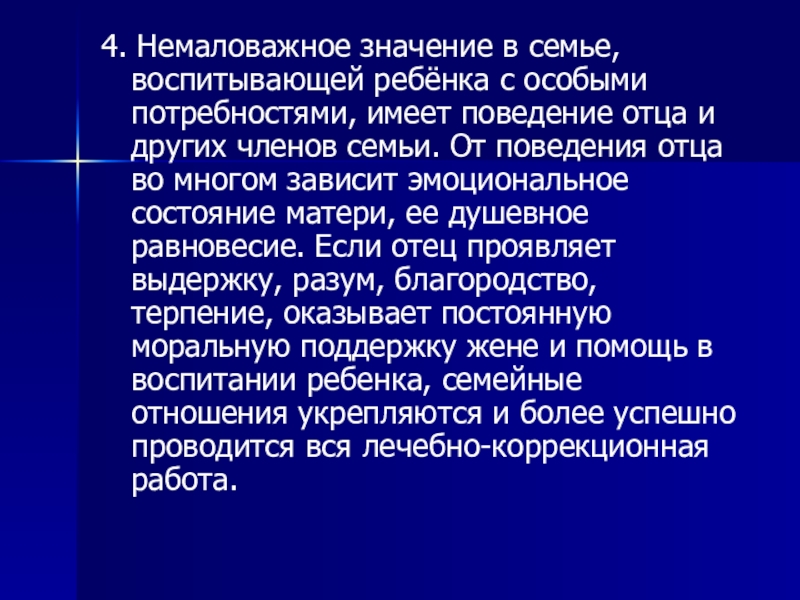 поведение отца и других членов семьи. От поведения отца во многом зависит эмоциональное состояние матери, ее душевное равновесие. Если отец проявляет выдержку, разум, благородство, терпение, оказывает постоянную моральную поддержку жене и помощь в воспитании ребенка, семейные отношения укрепляются и более успешно проводится вся лечебно-коррекционная работа.
