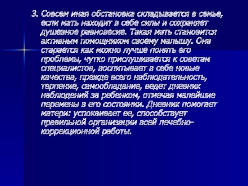 себе силы и сохраняет душевное равновесие. Такая мать становится активным помощником своему малышу. Она старается как можно лучше понять его проблемы, чутко прислушивается к советам специалистов, воспитывает в себе новые качества, прежде всего наблюдательность, терпение, самообладание, ведет дневник наблюдений за ребенком, отмечая малейшие перемены в его состоянии. Дневник помогает матери: успокаивает ее, способствует правильной организации всей лечебно-коррекционной работы.