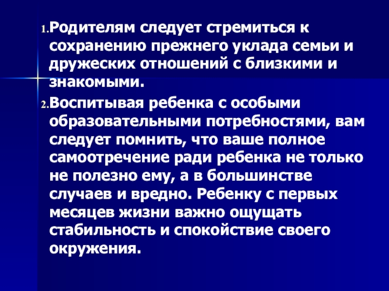 Воспитывая ребенка с особыми образовательными потребностями, вам следует помнить, что ваше полное самоотречение ради ребенка не только не полезно ему, а в большинстве случаев и вредно. Ребенку с первых месяцев жизни важно ощущать стабильность и спокойствие своего окружения.