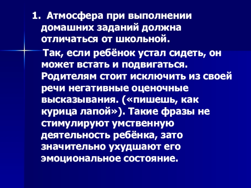 1. Атмосфера при выполнении домашних заданий должна отличаться от школьной.