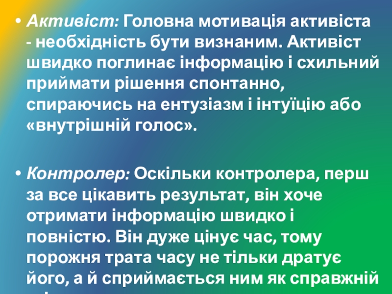 Слайд 7Активіст: Головна мотивація активіста - необхідність бути визнаним. Активіст швидко поглинає