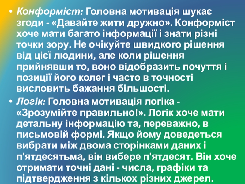 Слайд 8Конформіст: Головна мотивація шукає згоди - «Давайте жити дружно». Конформіст хоче