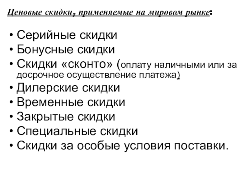 Слайд 21Ценовые скидки, применяемые на мировом рынке: