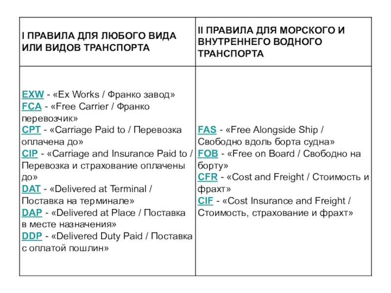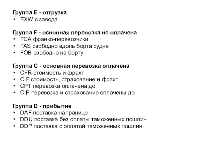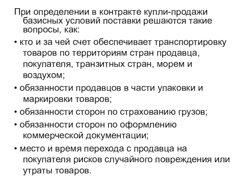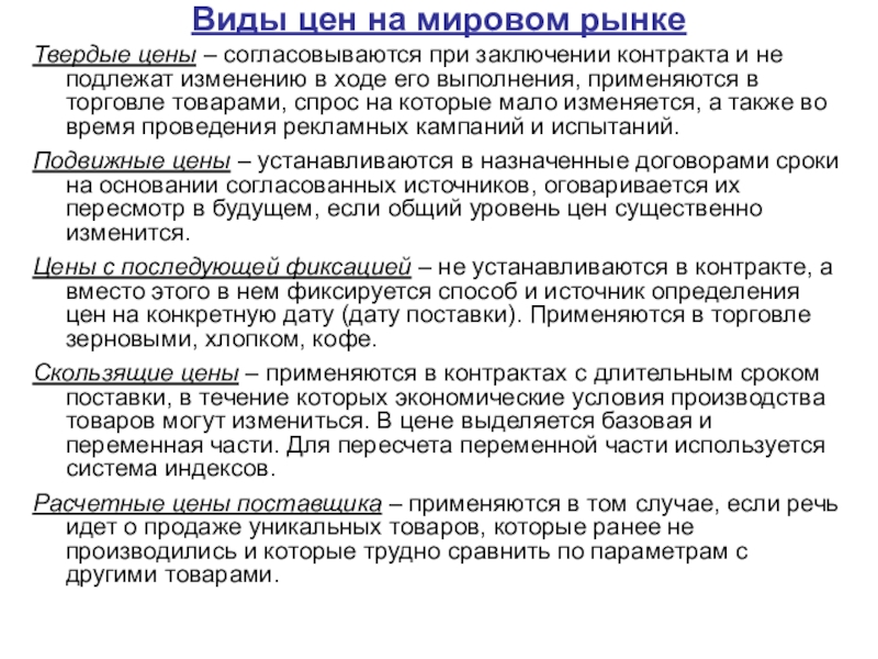 Цены с последующей фиксацией – не устанавливаются в контракте, а вместо этого в нем фиксируется способ и источник определения цен на конкретную дату (дату поставки). Применяются в торговле зерновыми, хлопком, кофе.