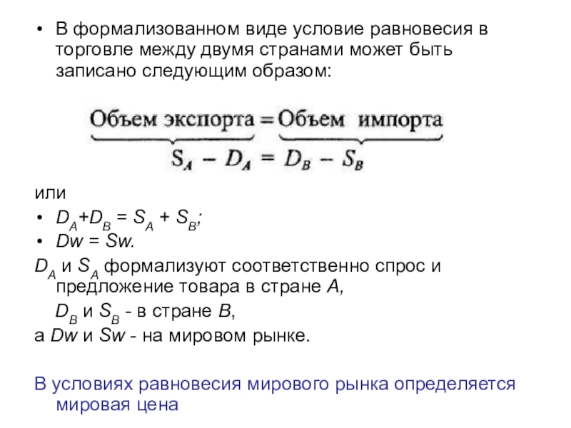 Слайд 17В формализованном виде условие равновесия в торговле между двумя странами может