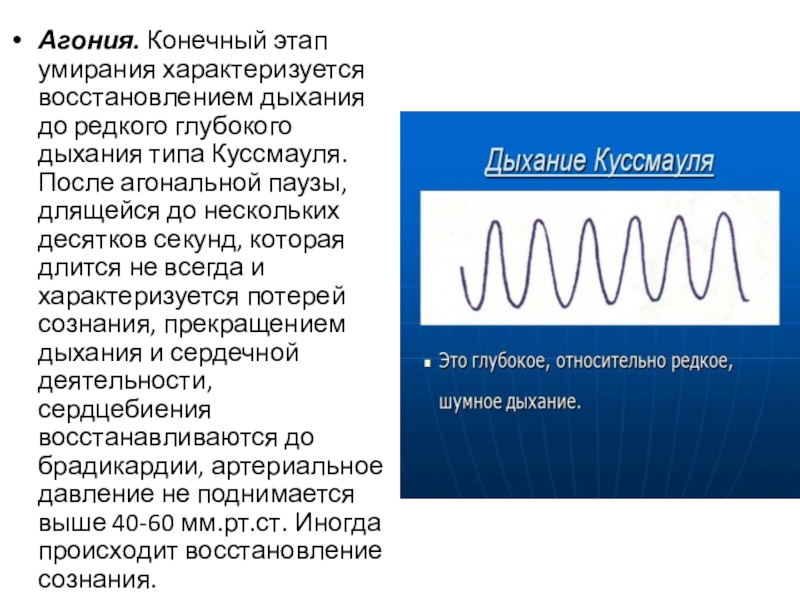 Слайд 6Агония. Конечный этап умирания характеризуется восстановлением дыхания до редкого глубокого дыхания