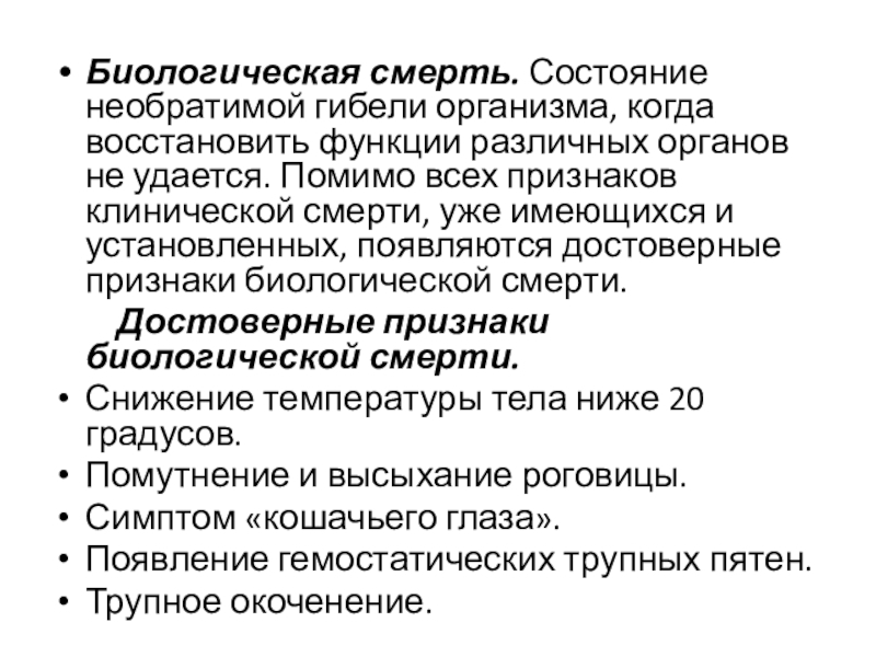 Слайд 8Биологическая смерть. Состояние необратимой гибели организма, когда восстановить функции различных органов