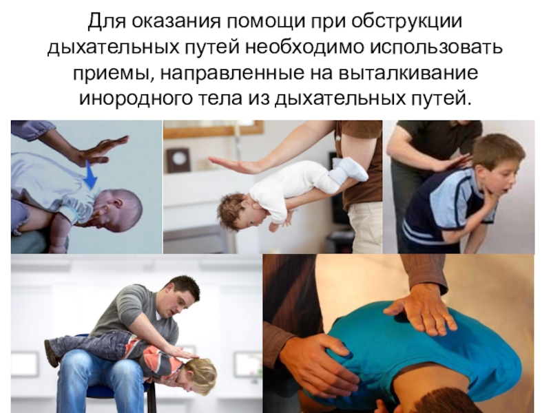 Для оказания помощи при обструкции дыхательных путей необходимо использовать приемы, направленные
