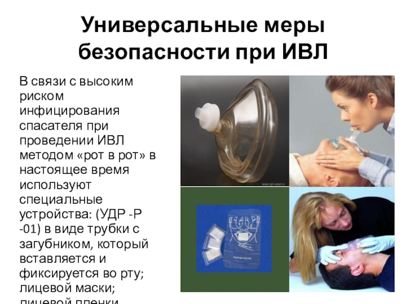 риском инфицирования спасателя при проведении ИВЛ методом «рот в рот» в настоящее время используют специальные устройства: (УДР -Р -01) в виде трубки с загубником, который вставляется и фиксируется во рту; лицевой маски; лицевой пленки.