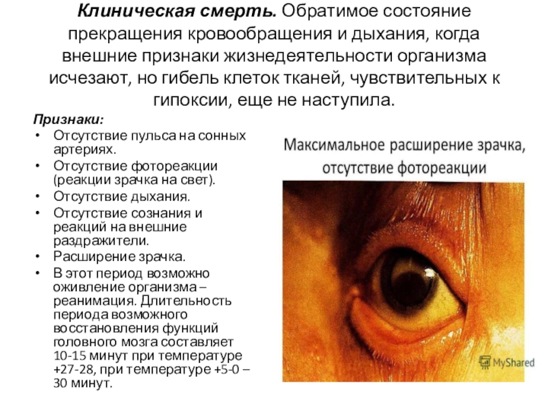 Клиническая смерть. Обратимое состояние прекращения кровообращения и дыхания, когда внешние признаки