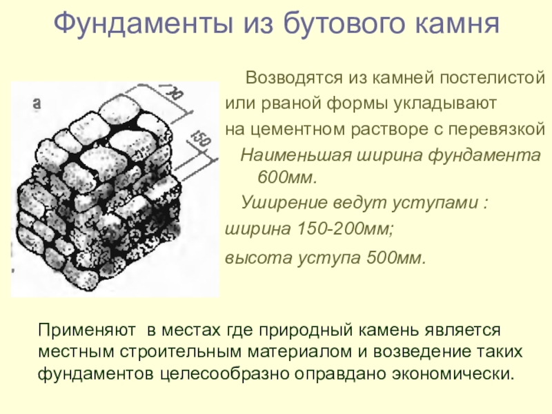 Применяют в местах где природный камень является местным строительным материалом и возведение таких фундаментов целесообразно оправдано экономически.
