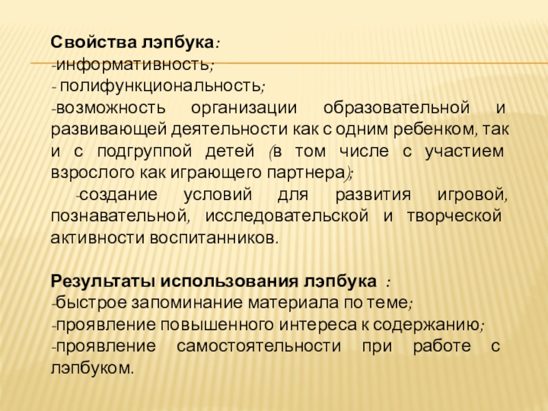 Свойства лэпбука:-информативность;- полифункциональность;-возможность организации образовательной и развивающей деятельности как с одним ребенком, так и с подгруппой детей
