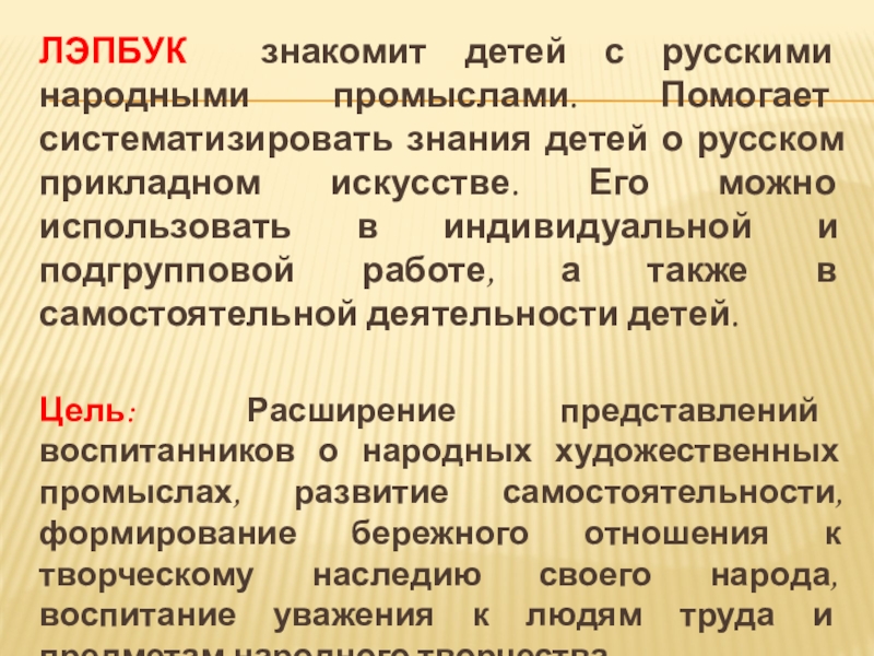 ЛЭПБУК знакомит детей с русскими народными промыслами. Помогает систематизировать знания детей о русском прикладном искусстве. Его можно использовать в индивидуальной и подгрупповой работе, а также в самостоятельной деятельности детей.Цель: