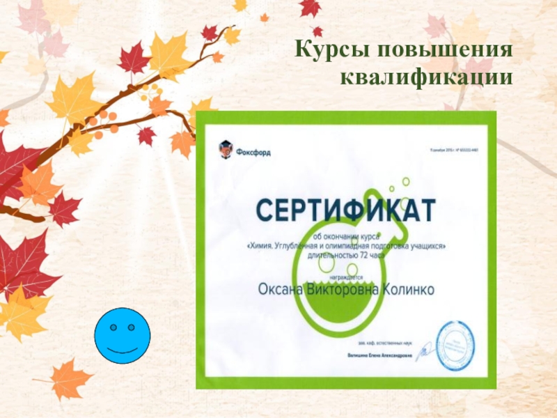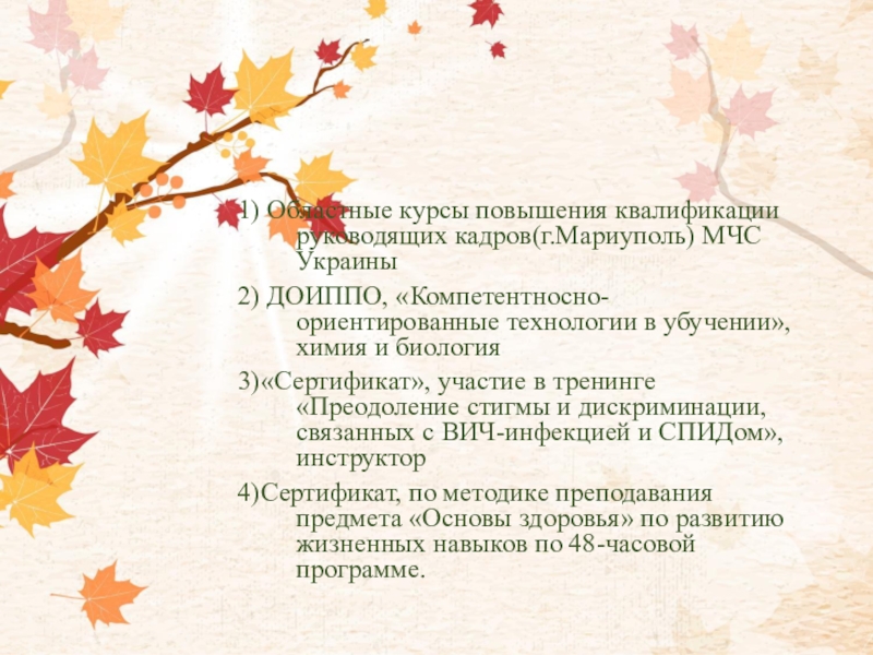 1) Областные курсы повышения квалификации руководящих кадров(г.Мариуполь) МЧС Украины2) ДОИППО, «Компетентносно-ориентированные технологии в убучении», химия и биология3)«Сертификат»,