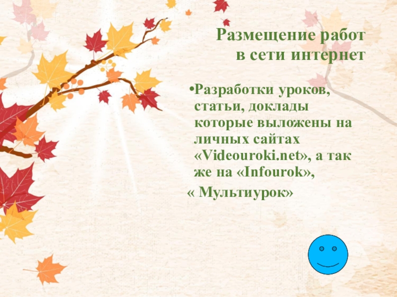 Размещение работ  в сети интернетРазработки уроков, статьи, доклады которые выложены на личных сайтах «Videouroki.net», а так