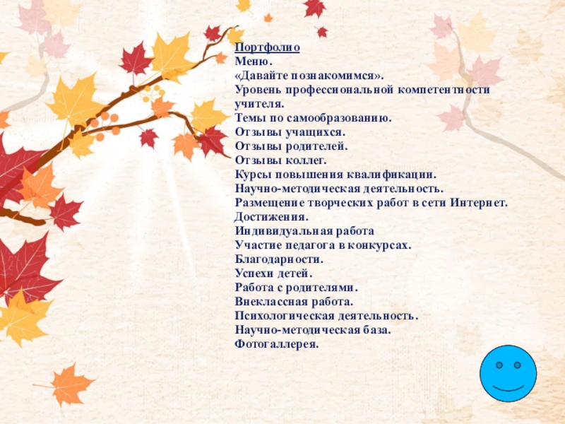 Портфолио Меню. «Давайте познакомимся». Уровень профессиональной компетентности учителя. Темы по самообразованию. Отзывы учащихся. Отзывы родителей. Отзывы коллег. Курсы повышения квалификации. Научно-методическая деятельность. Размещение творческих работ в сети Интернет. Достижения. Индивидуальная работа Участие педагога в конкурсах. Благодарности.