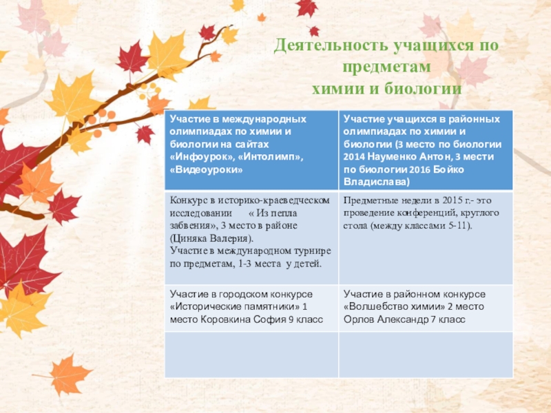 Деятельность учащихся по предметам химии и биологии
