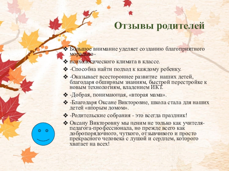 Отзывы родителейБольшое внимание уделяет созданию благоприятного морально-психологического климата в классе.-Способна найти подход к каждому ребенку.-Оказывает всестороннее развитие
