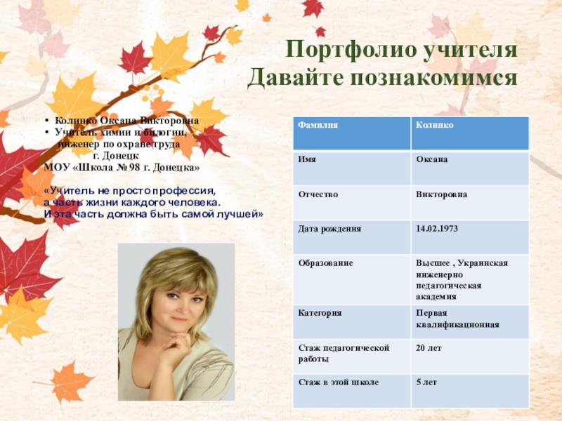 Портфолио учителя Давайте познакомимсяКолинко Оксана ВикторовнаУчитель химии и билогии,   инженер по охране труда