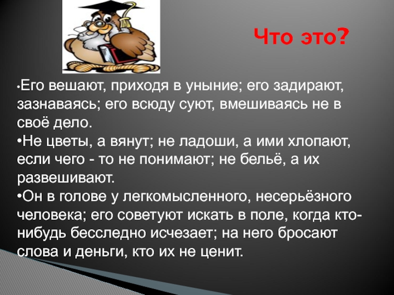•Он в голове у легкомысленного, несерьёзного человека; его советуют искать в поле, когда кто-нибудь бесследно исчезает; на него бросают слова и деньги, кто их не ценит.