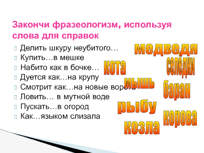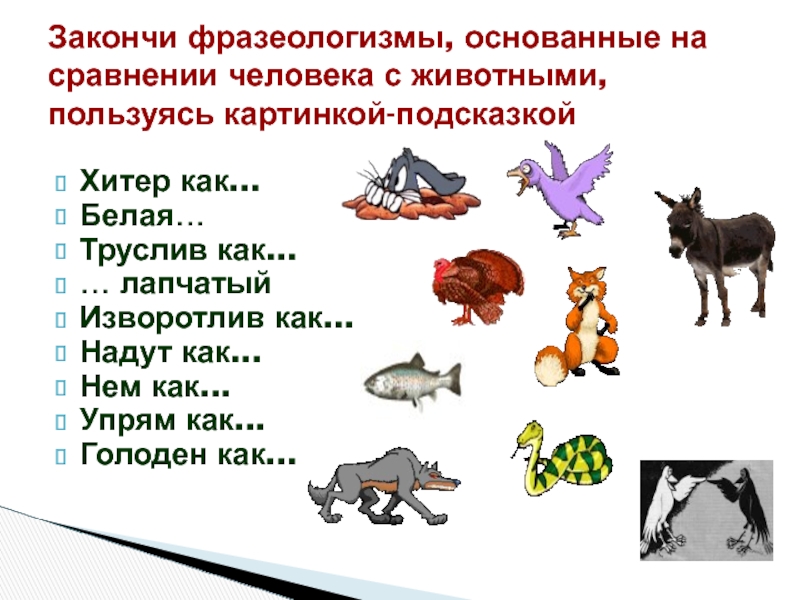 Закончи фразеологизмы, основанные на сравнении человека с животными, пользуясь картинкой-подсказкой