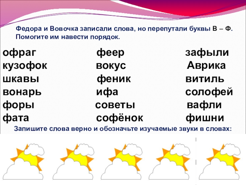 Запишите слова верно и обозначьте изучаемые звуки в словах: