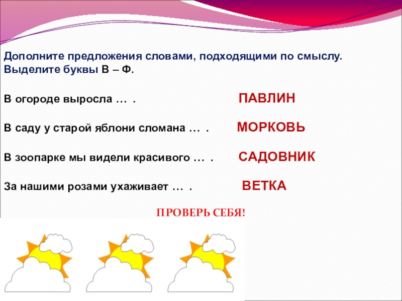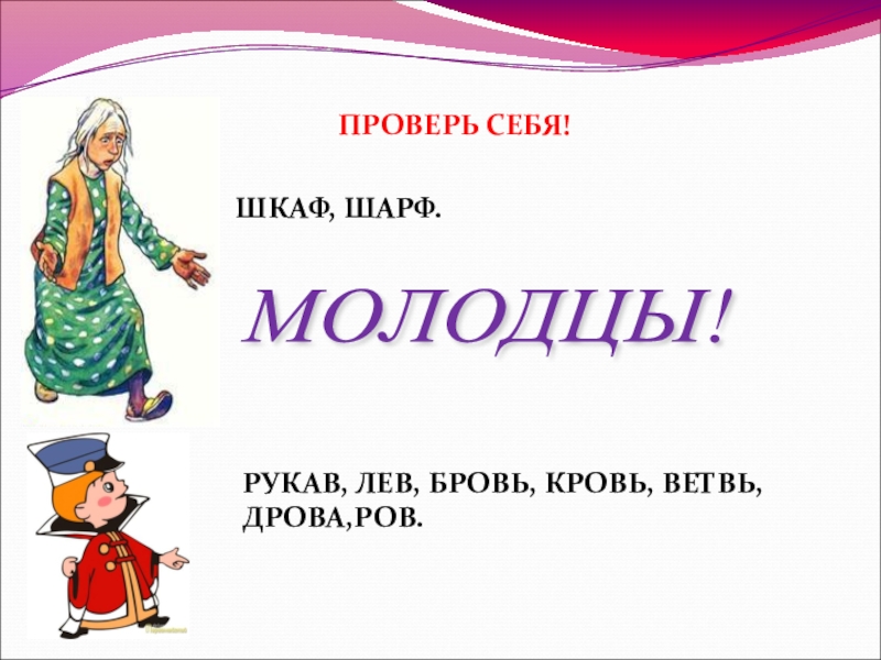 Овраг, кузовок, шкафы, фонарь, воры, веер, фата, фокус, веник, ива, совёнок, завыли, Африка, фитиль, соловей, вафли, вишни.