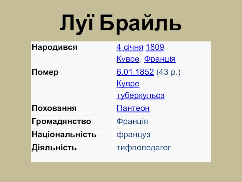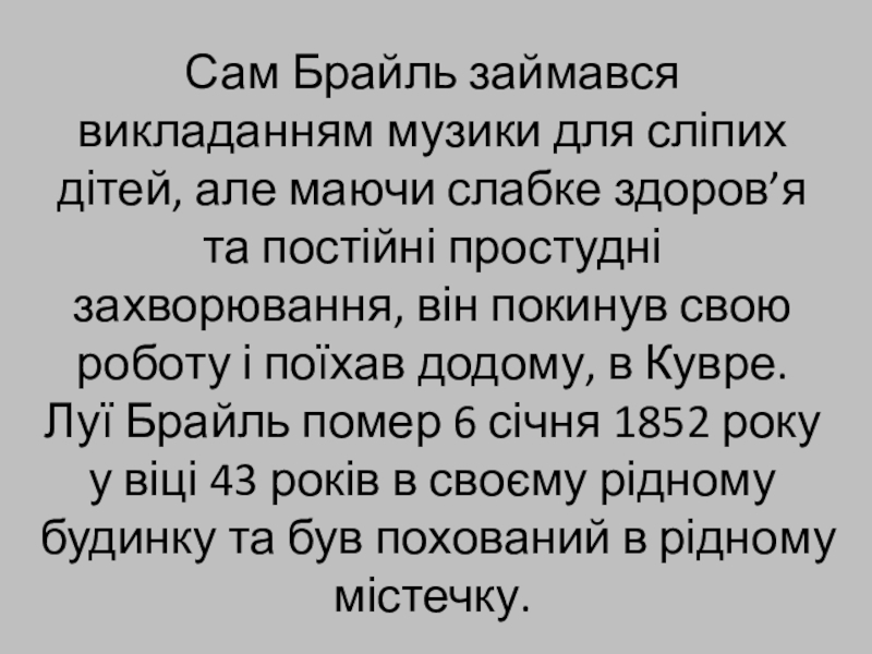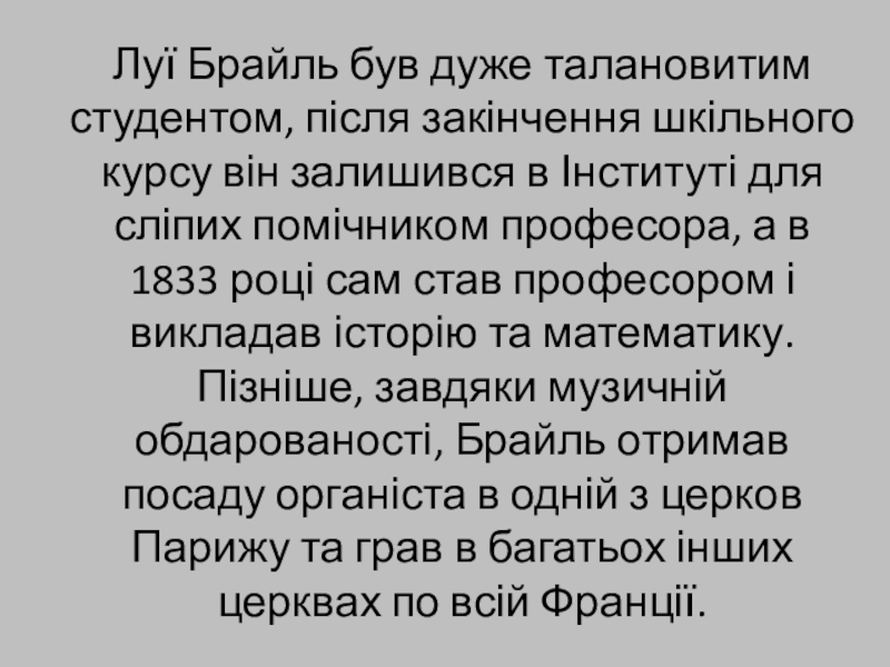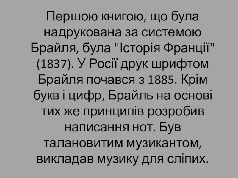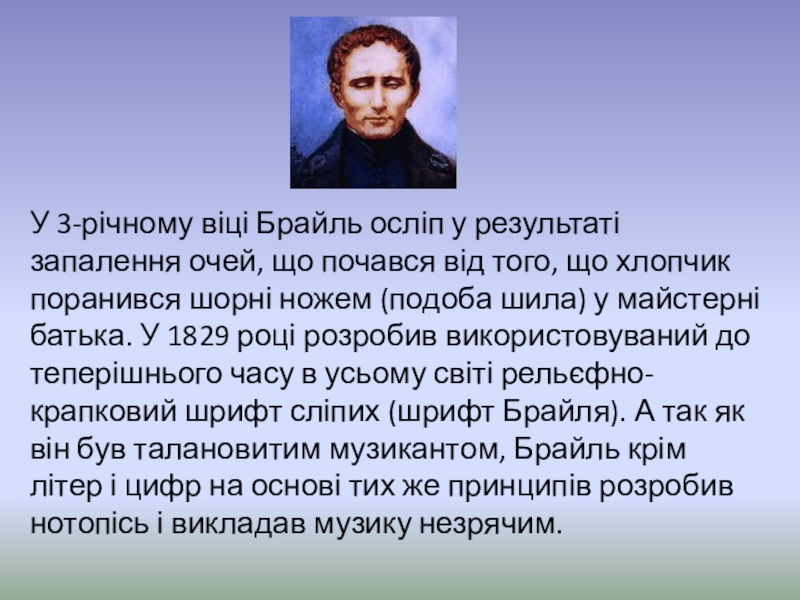В 1829 РОЗРОБИВ РЕЛЬЄФНО-КРАПКОВИЙ ШРИФТ ДЛЯ СЛІПИХ, ЩО ВИКОРИСТОВУЄТЬСЯ І ДОТЕПЕР В УСЬОМУ СВІТІ.