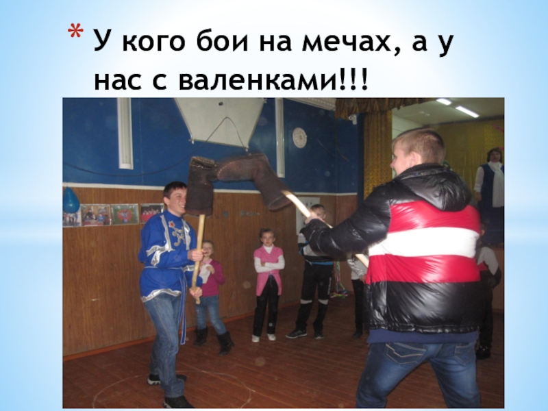Слайд 16У кого бои на мечах, а у нас с валенками!!!
