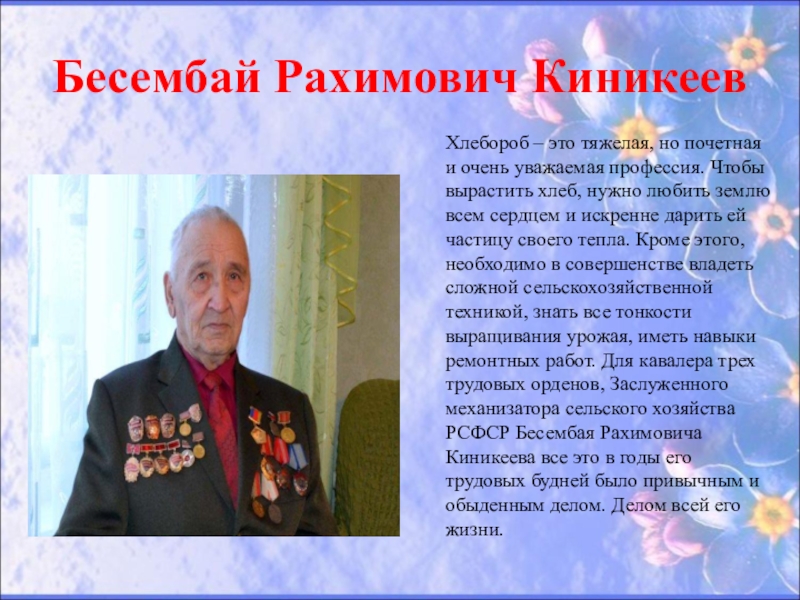 профессия. Чтобы вырастить хлеб, нужно любить землю всем сердцем и искренне дарить ей частицу своего тепла. Кроме этого, необходимо в совершенстве владеть сложной сельскохозяйственной техникой, знать все тонкости выращивания урожая, иметь навыки ремонтных работ. Для кавалера трех трудовых орденов, Заслуженного механизатора сельского хозяйства РСФСР Бесембая Рахимовича Киникеева все это в годы его трудовых будней было привычным и обыденным делом. Делом всей его жизни.