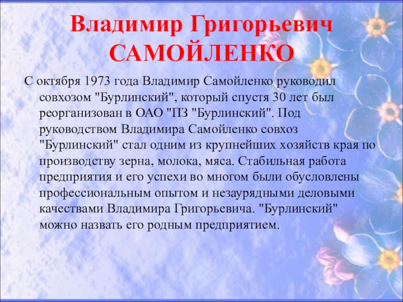 который спустя 30 лет был реорганизован в ОАО "ПЗ "Бурлинский". Под руководством Владимира Самойленко совхоз "Бурлинский" стал одним из крупнейших хозяйств края по производству зерна, молока, мяса. Стабильная работа предприятия и его успехи во многом были обусловлены профессиональным опытом и незаурядными деловыми качествами Владимира Григорьевича. "Бурлинский" можно назвать его родным предприятием.