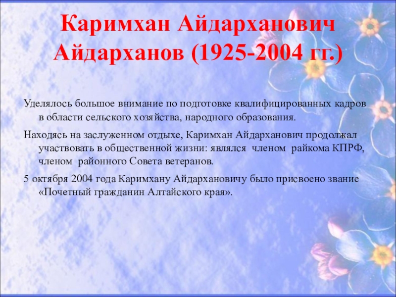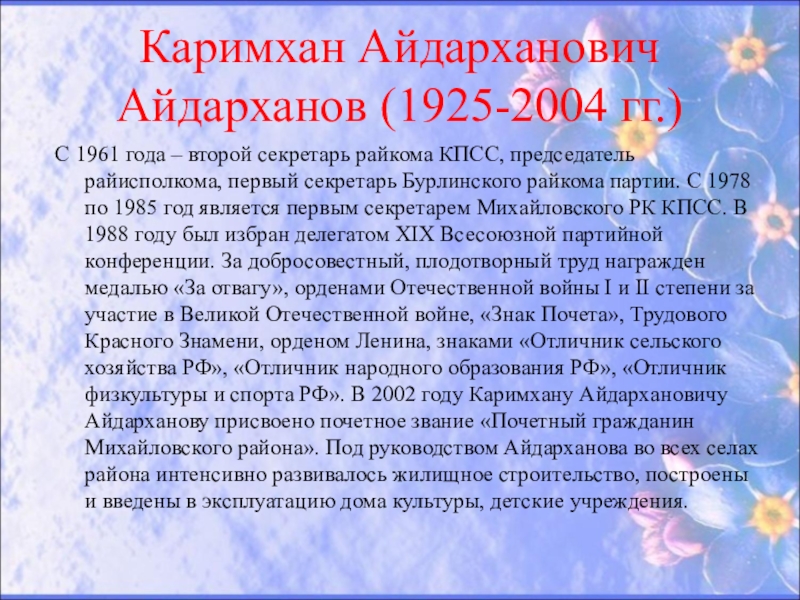 Слайд 3Каримхан Айдарханович Айдарханов (1925-2004 гг.)
