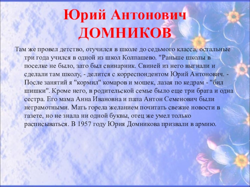 класса, остальные три года учился в одной из школ Колпашево. "Раньше школы в поселке не было, зато был свинарник. Свиней из него выгнали и сделали там школу, - делится с корреспондентом Юрий Антонович. - После занятий я "кормил" комаров и мошек, лазая по кедрам - "бил шишки". Кроме него, в родительской семье было еще три брата и одна сестра. Его мама Анна Ивановна и папа Антон Семенович были неграмотными. Мать горела желанием почитать свежие новости в газете, но не знала ни одной буквы, отец же умел только расписываться. В 1957 году Юрия Домникова призвали в армию.