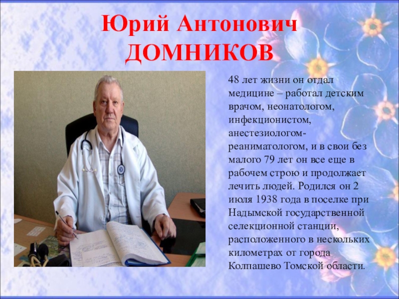 врачом, неонатологом, инфекционистом, анестезиологом-реаниматологом, и в свои без малого 79 лет он все еще в рабочем строю и продолжает лечить людей. Родился он 2 июля 1938 года в поселке при Надымской государственной селекционной станции, расположенного в нескольких километрах от города Колпашево Томской области.