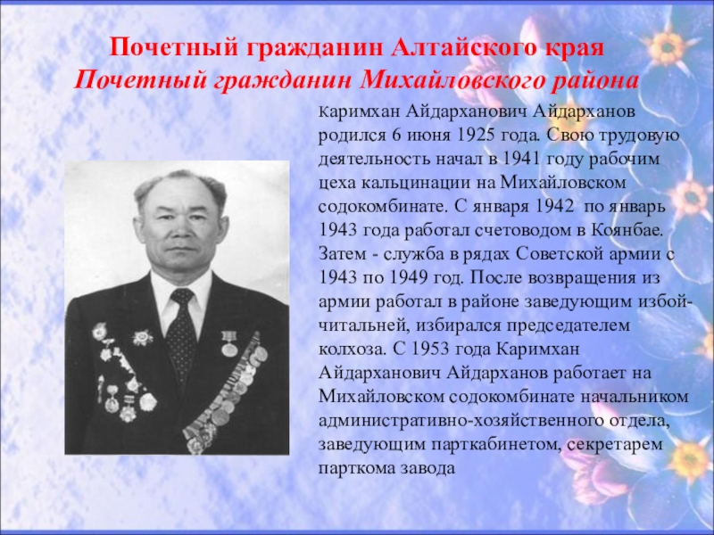 июня 1925 года. Свою трудовую деятельность начал в 1941 году рабочим цеха кальцинации на Михайловском содокомбинате. С января 1942 по январь 1943 года работал счетоводом в Коянбае. Затем - служба в рядах Советской армии с 1943 по 1949 год. После возвращения из армии работал в районе заведующим избой-читальней, избирался председателем колхоза. С 1953 года Каримхан Айдарханович Айдарханов работает на Михайловском содокомбинате начальником административно-хозяйственного отдела, заведующим парткабинетом, секретарем парткома завода