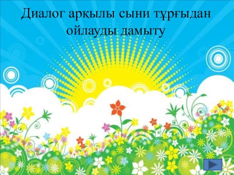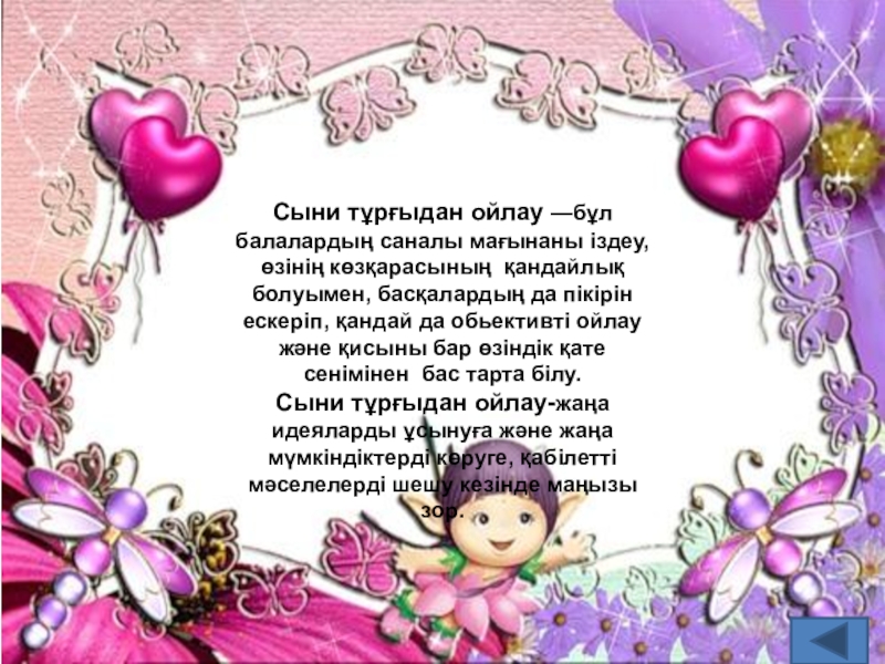 Сыни тұрғыдан ойлау —бұл балалардың саналы мағынаны іздеу, өзінің көзқарасының қандайлық болуымен, басқалардың да пікірін ескеріп, қандай да обьективті ойлау және қисыны бар өзіндік қате сенімінен бас тарта білу.
