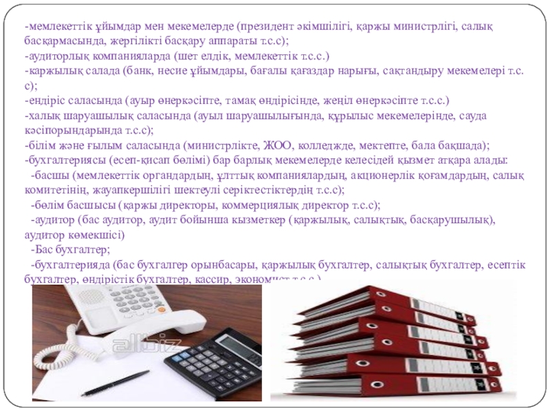 Слайд 6-мемлекеттік ұйымдар мен мекемелерде (президент әкімшілігі, қаржы министрлігі, салық басқармасында, жергілікті