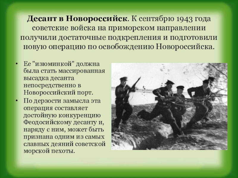 Слайд 15Десант в Новороссийск. К сентябрю 1943 года советские войска на приморском