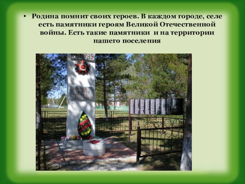 Слайд 18Родина помнит своих героев. В каждом городе, селе есть памятники героям
