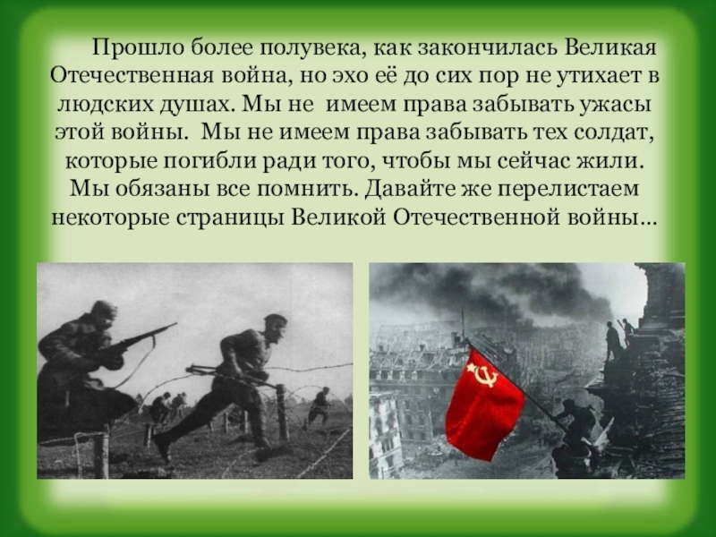 война, но эхо её до сих пор не утихает в людских душах. Мы не имеем права забывать ужасы этой войны. Мы не имеем права забывать тех солдат, которые погибли ради того, чтобы мы сейчас жили. Мы обязаны все помнить. Давайте же перелистаем некоторые страницы Великой Отечественной войны…